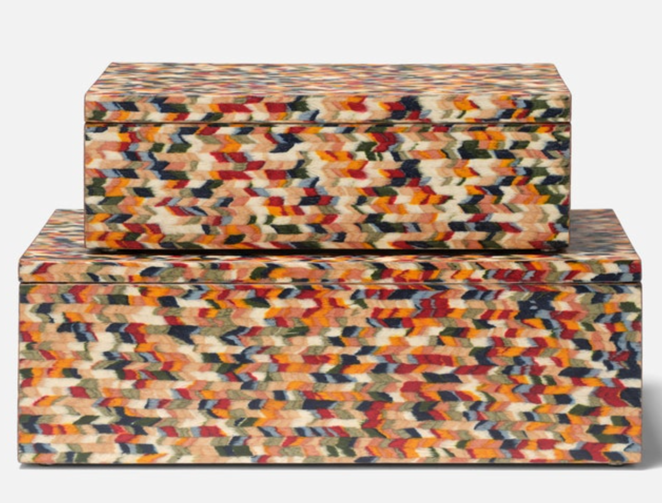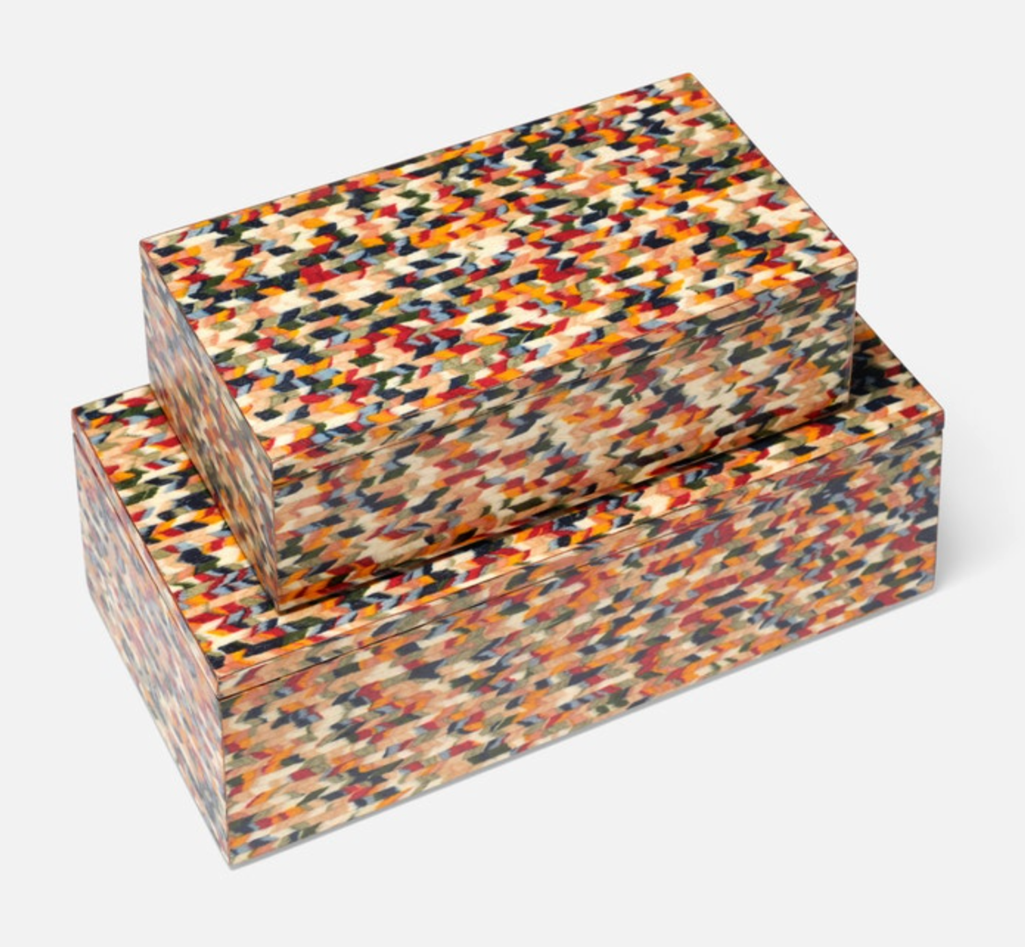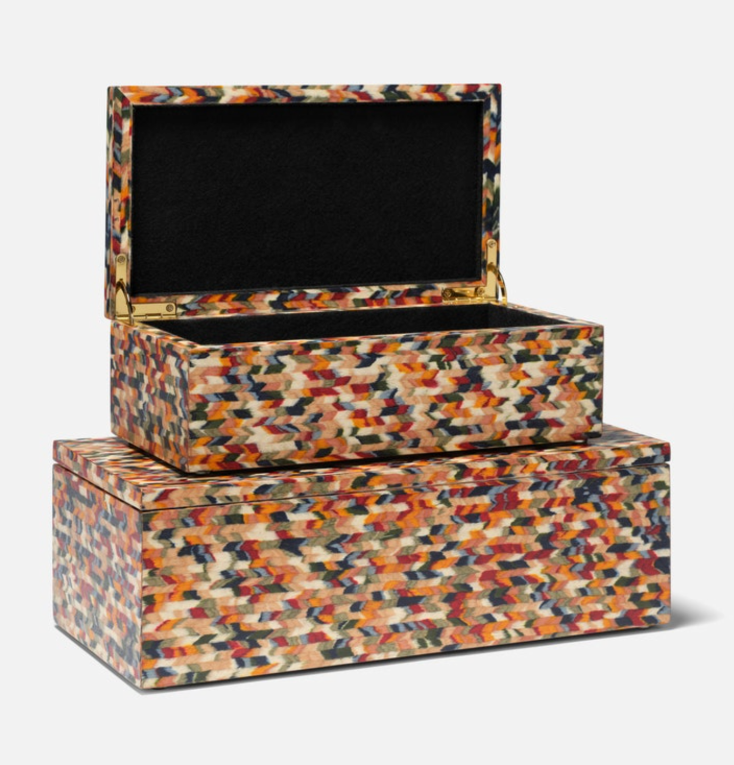 Pair of Agnes Boxes $495.00 Excl. tax In stock Add to cartLogin for wishlistDescriptionA pair of multicolor pixel reconstituted veneer boxes with black velvet interiors. 11"L x 6"W x 4"H 14"L x 8"W x 5"H