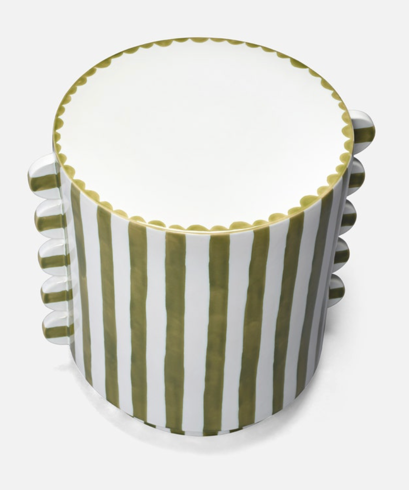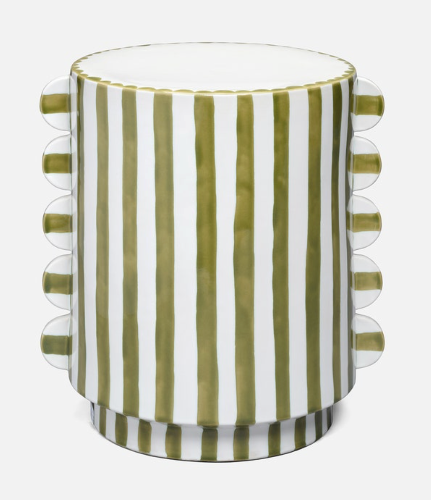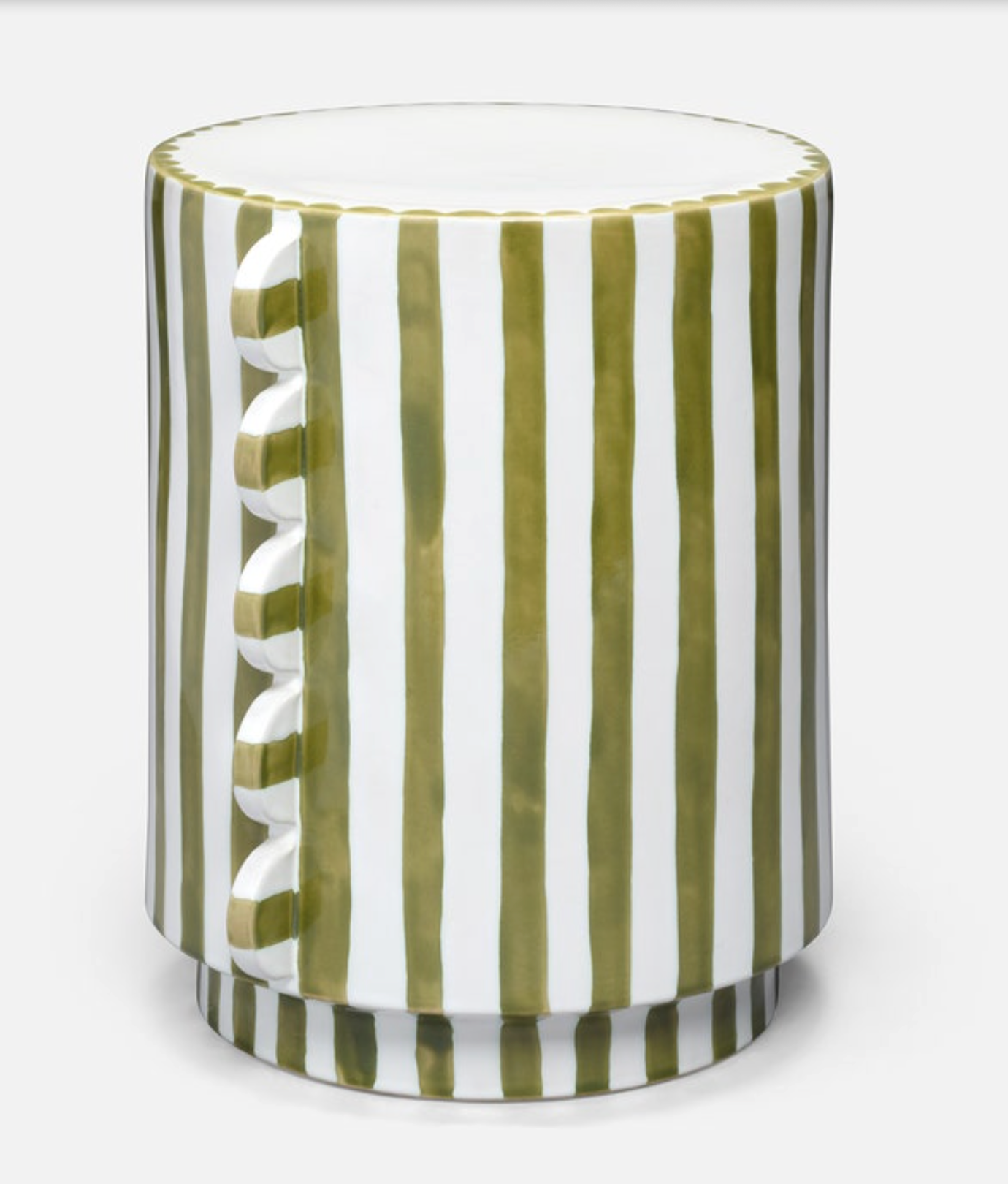 Betsy Stool in White and Olive Green $525.00 Excl. tax In stock Add to cartLogin for wishlistDescriptionA striped and scalloped designed ceramic stool inspired by Italian coast design. 14"D x 17"H
