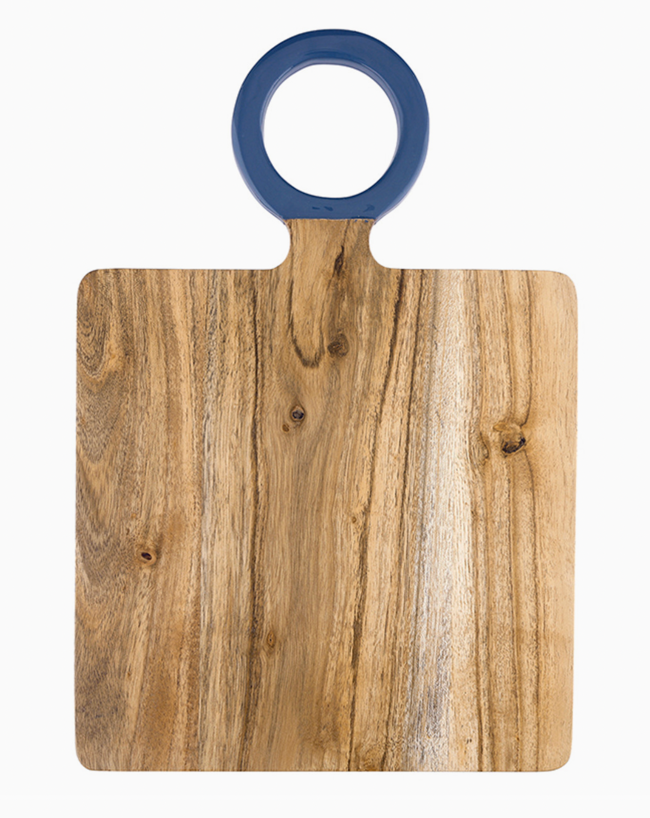 Blue Enamel Handle Wood Board $36.00 Excl. tax In stock Add to cartLogin for wishlistDescriptionAcacia wood cutting or serving board with a circular, deep blue, enamel handle. 15" L x 10" W x .5" H