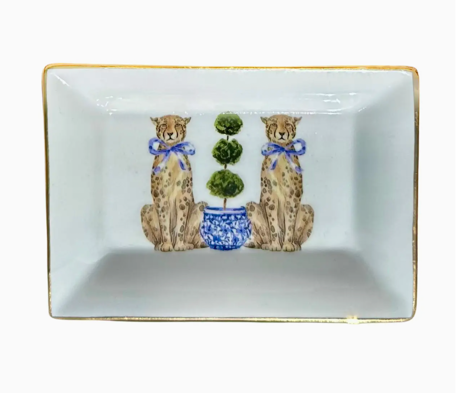 Chinoiserie Leopard Trinket Tray $25.00 Excl. tax In stock Add to cartLogin for wishlistDescriptionPorcelain trinket tray with two leopards with blue bows and a topiary in a blue and white chinoiserie pot in the center. 5" x 3.5" x 1"