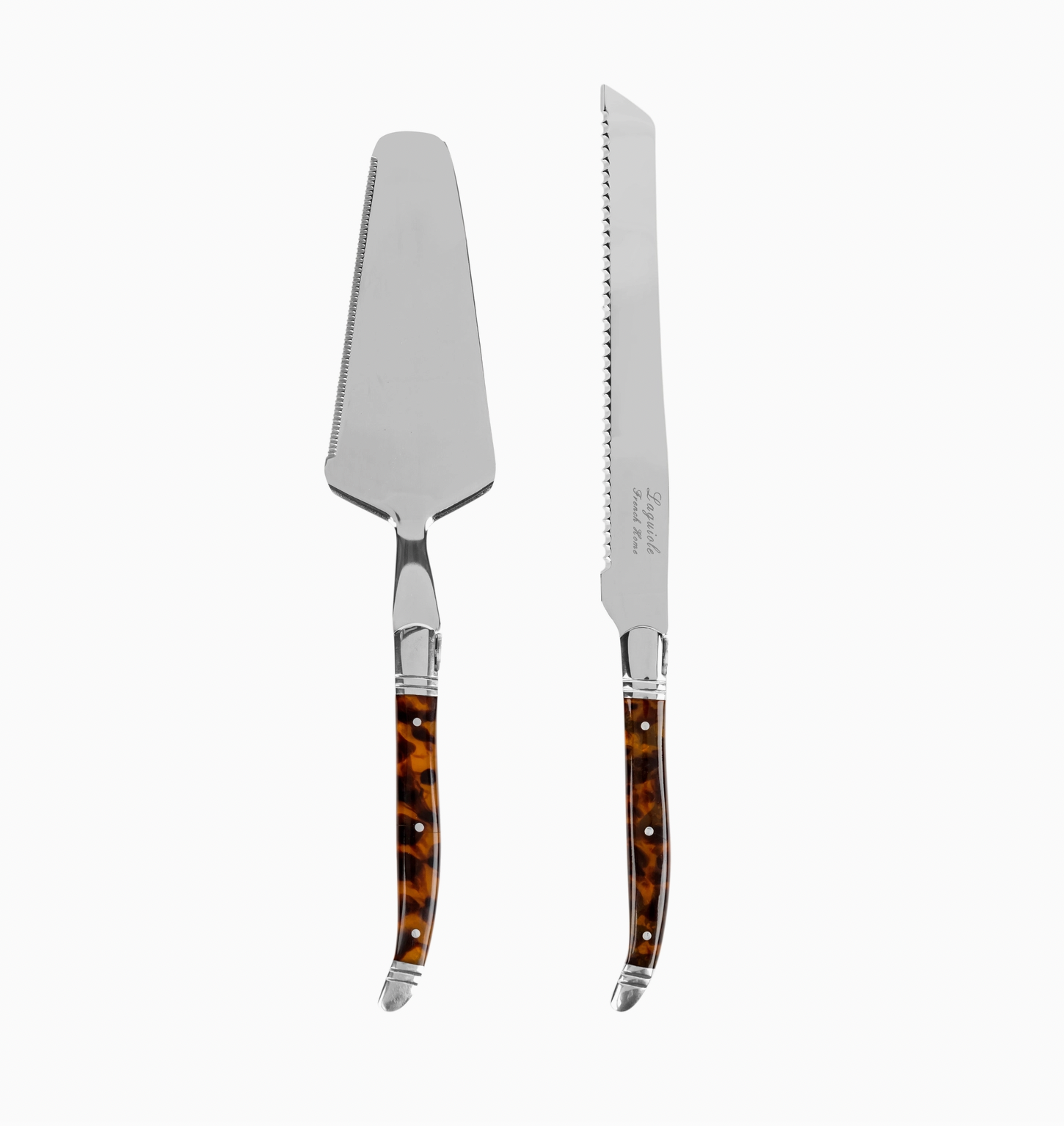 Connoisseur Laguiole Tortoise Shell Cake & Pie Server Set $59.00 Excl. tax In stock Add to cartLogin for wishlistDescriptionStainless steel cake and pie server knife set. The Laguiole design of these servers features three-rivet curved, tortoise shell handles with etching on the spine with bee emblems on the bolster symbolizing the Napoleon Monarchy. 11.5" x 2.5" x 0.5"