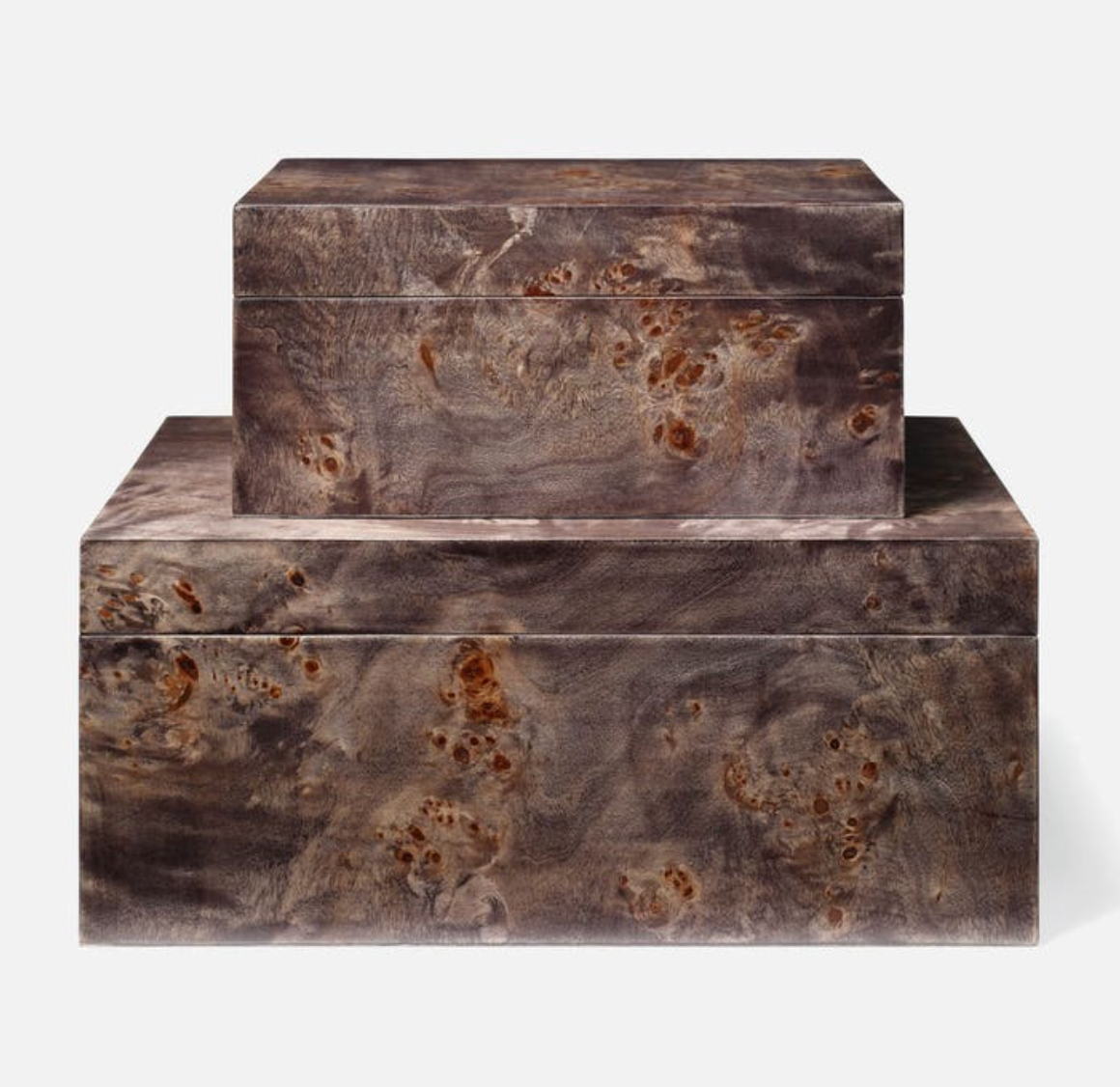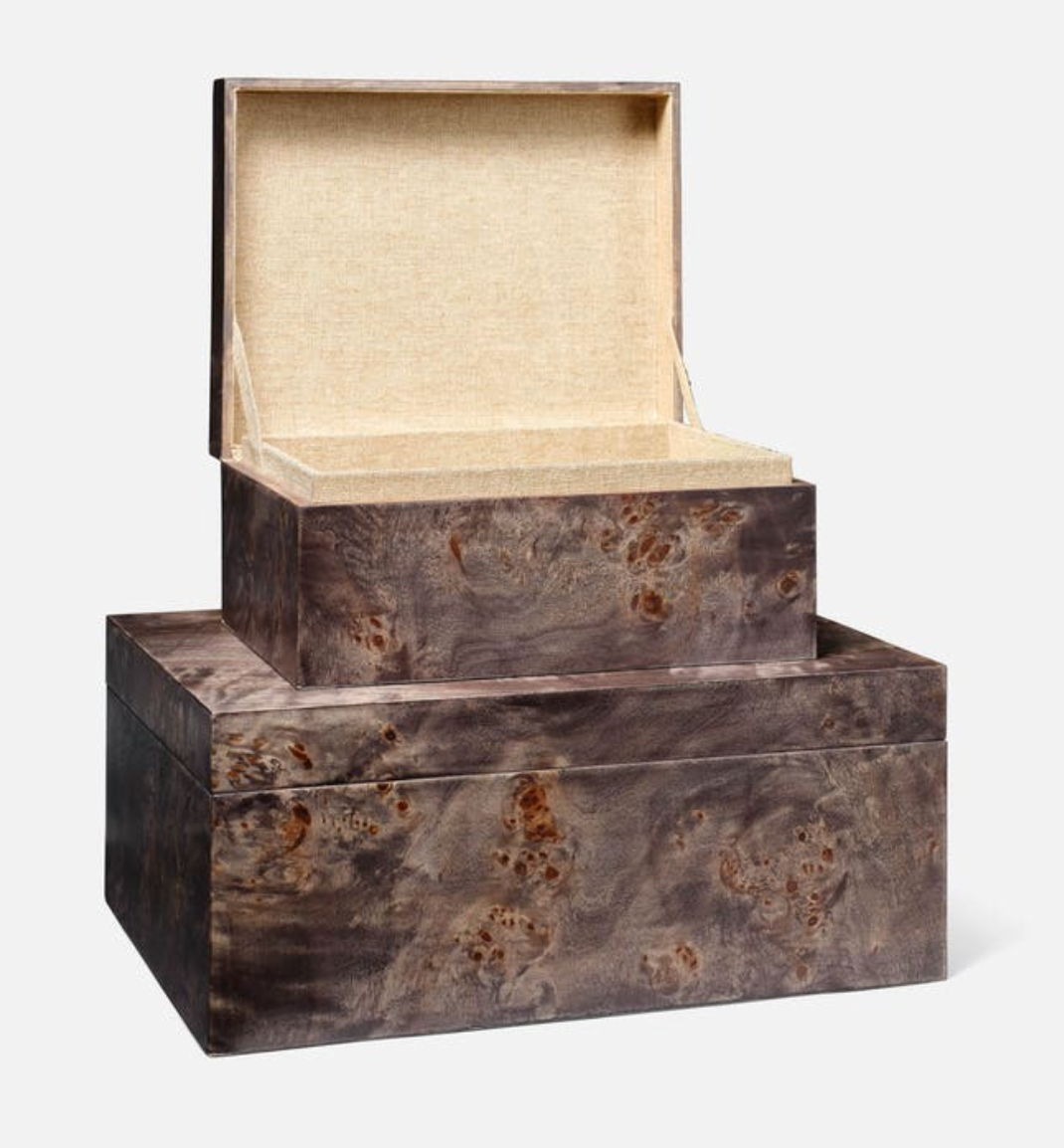 Elita Box Set of Two $525.00 Excl. tax In stock Add to cartLogin for wishlistDescriptionSet of two hinged Mappa burl boxes in ash gray with linen interiors. 9"L x 7"W x 4"H 13"L x 10"W x 5"H