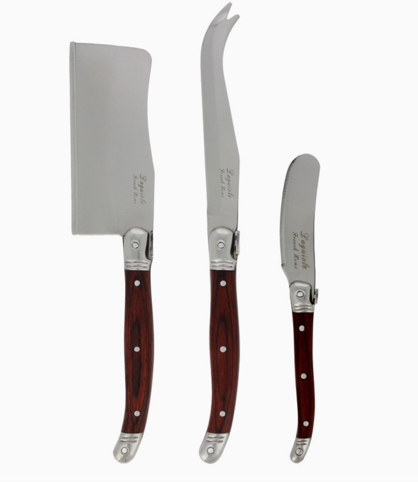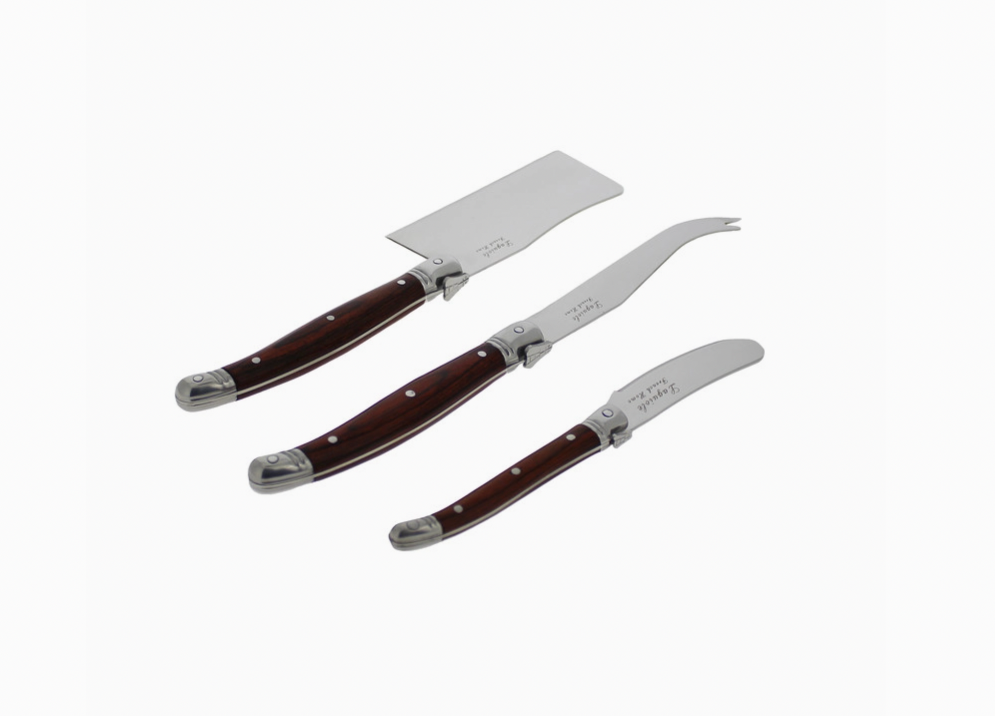 French Home Laguiole Cheese Knife Set $47.00 Excl. tax In stock Add to cartLogin for wishlistDescriptionThree stainless steel cheese knives with Pakkawood and three rivet curved handles and bee emblem. Styled after Laguiole, a town in France. 8.5" Cleaver, 9.25" Spear and 6.25" Spreader