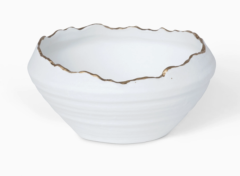 Gilded Organic Edge Bowl 6" $14.00 Excl. tax In stock Add to cartLogin for wishlistDescriptionHand painted white porcelain bowl with a golden rim, imperfect ridges and edges, and a thrown clay formation, perfect for decoration, or use as a planter or catch-all bowl. 6x6x3 in