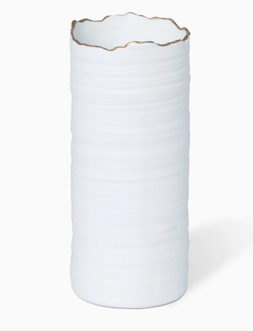Gilded Organic Edge Vase $22.00 Excl. tax In stock Add to cartLogin for wishlistDescriptionHanded painted, white porcelain vase with a golden rim with mperfect edges/ridges and a thrown clay formation, perfect for decoration on a shelf or displaying flowers. 4.3 x 4.3 x 9.5 in
