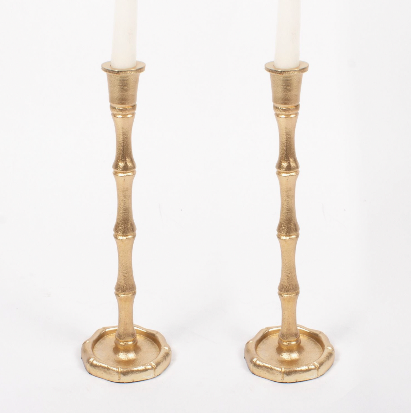 Pair of Gold Bamboo Candlesticks - Large $94.50 Excl. tax In stock Add to cartLogin for wishlistDescription11.75" Spot Clean Expertly crafted from aluminum with a chic gold finish. Holds a standard tapered candle (candles sold separately) Designed in the USA; Imported