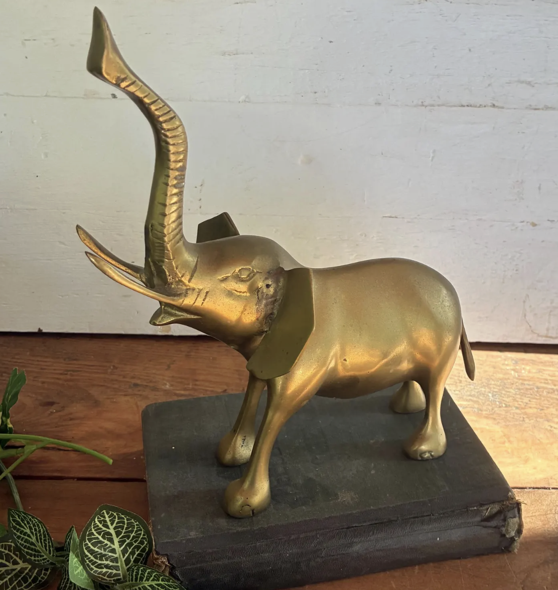 EHD-LARGE VINTAGE BRASS ELEPHANT - 9 1/4" TALL $95.00 Excl. tax In stock Add to cartLogin for wishlistDescriptionVintage brass elephant with trunk pointed up and uniquely geometric ears. 9.25 x 10 in