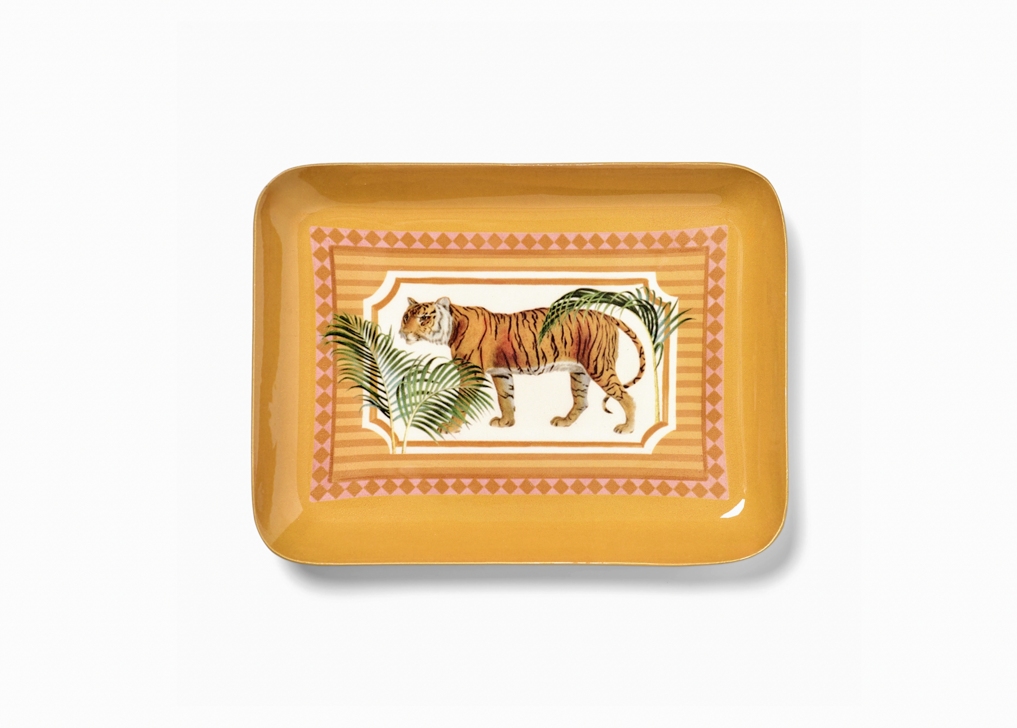 Tiger Rectangular Enamel Tray $19.00 Excl. tax In stock Add to cartLogin for wishlistDescriptionRectangular enamel tray featuring a bold 19th-century tiger illustration sourced from a French natural history encyclopedia, capturing the detail and curiosity of early scientific study. 4.6" x 6.1" Weight: 6.24 oz Made in India