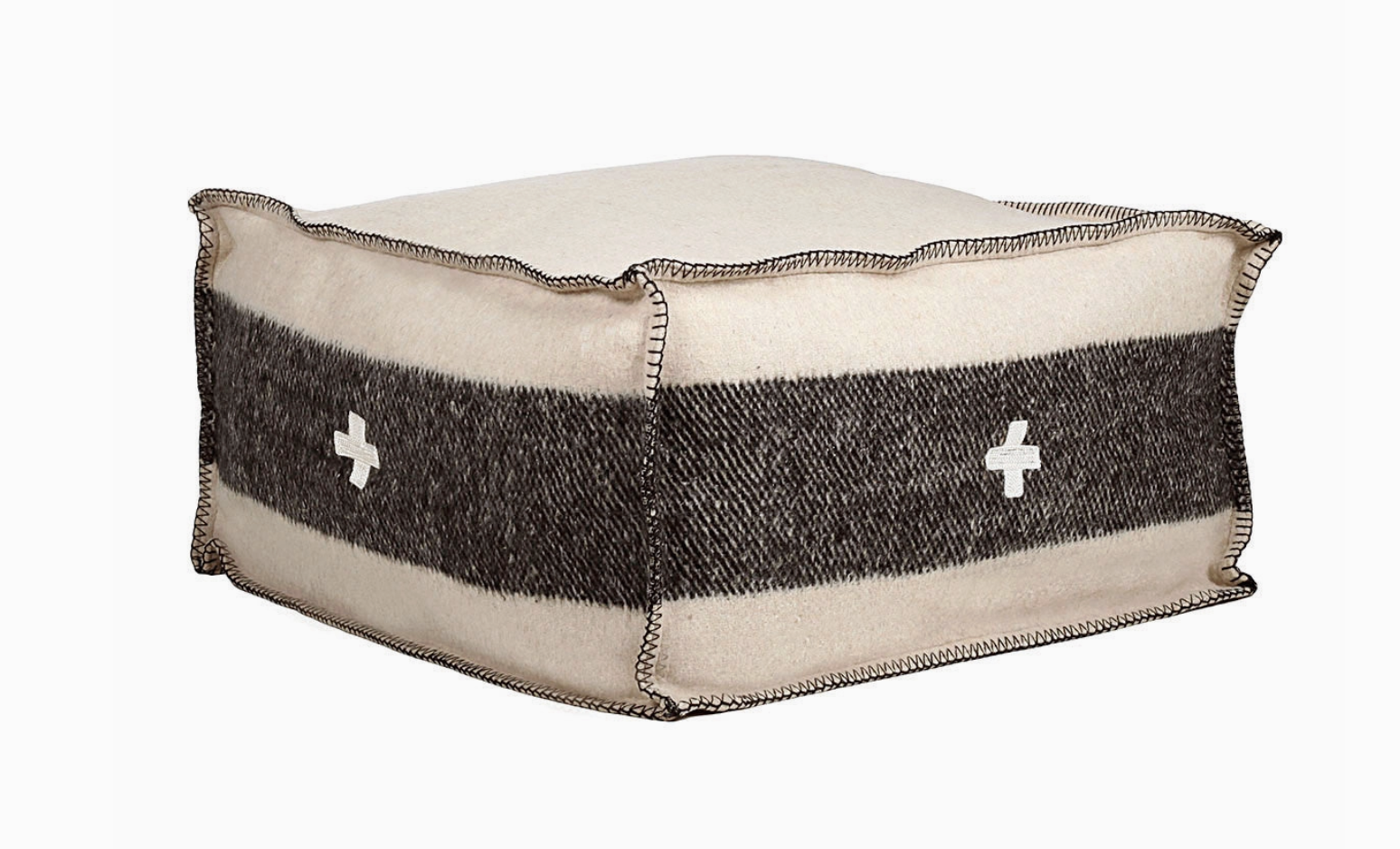 Swiss Army Pouf 24x24x13 Cream/Black - Unstuffed $30.00 Excl. tax In stock Add to cartLogin for wishlistDescriptionWith inspiration taken from original Swiss Army military blankets, these poufs are 66% wool and 34% fiber stitching with a zigzag hem. A creative and relaxing way to include seating in any space.