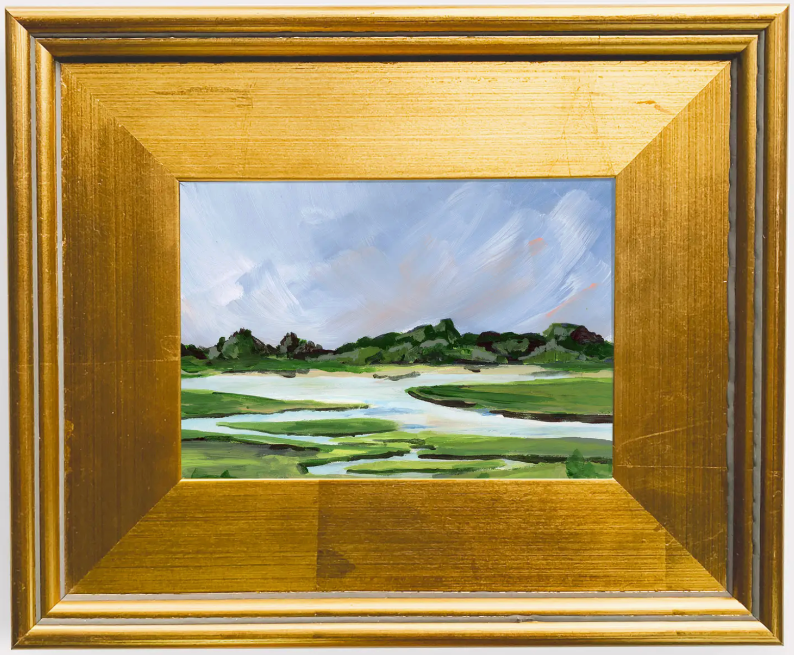 Tidal Marsh Painting in Gold Frame $195.00 Excl. tax In stock Add to cartLogin for wishlistDescriptionThe Tidal Marsh style landscape painting has a colorful sky, with blues accented by the pink glow of the sun. A tidal river works through an inlet and passes by a secret beach. 5" X 7", 10" x 12" including frame