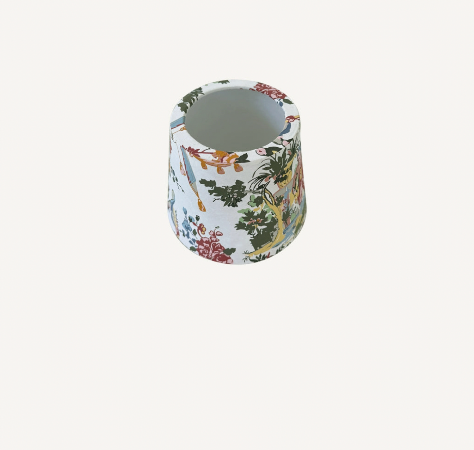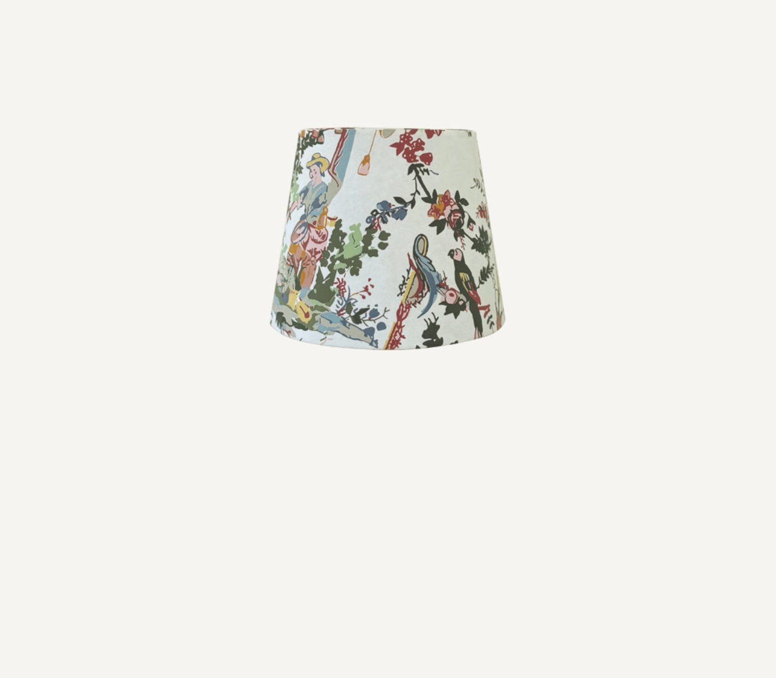 Toile Paper Shade Cover $69.00 Excl. tax In stock Add to cartLogin for wishlistDescriptionWhimsy multicolor toile paper shade cover perfect for cordless electric table lamps. Height: 3 1/2" top: 3 1/8" bottom: 4 1/2 Materials: paper Made in Italy