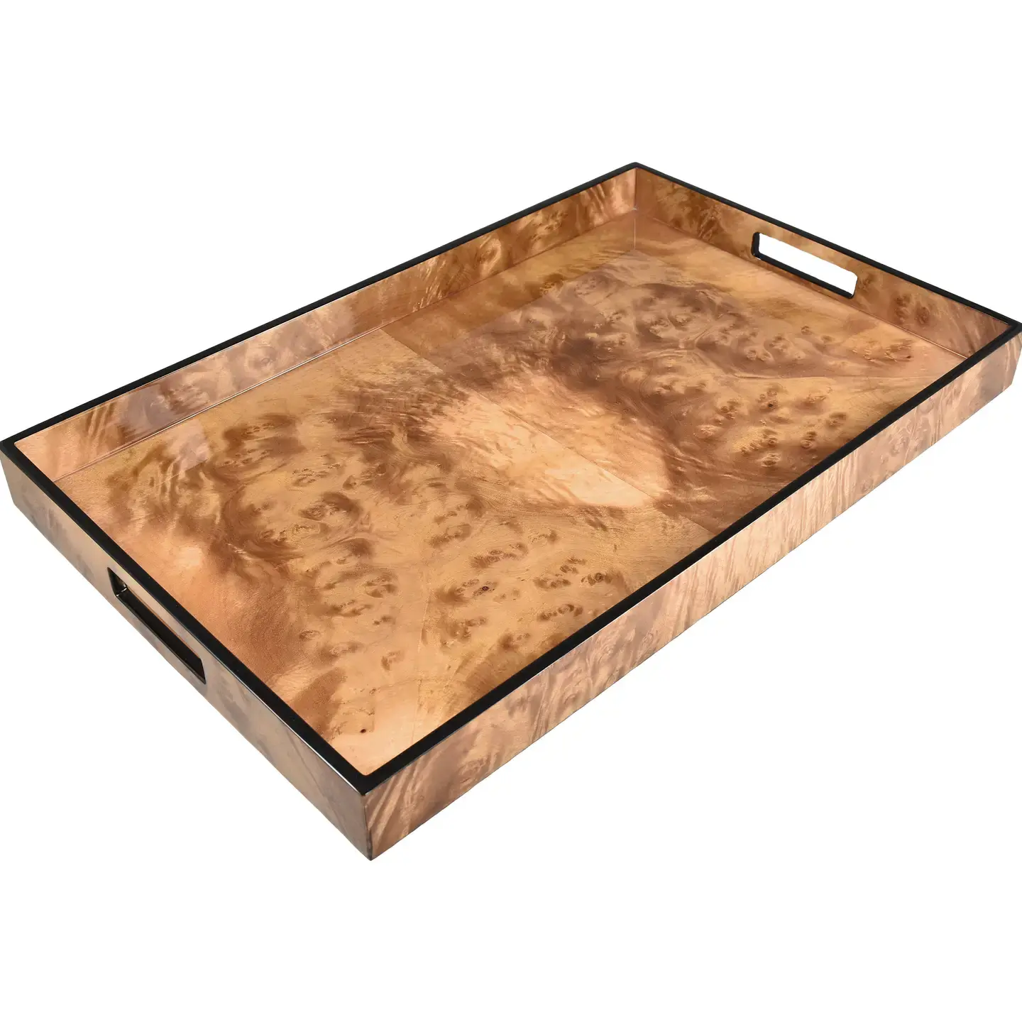 Walnut Burl Breakfast Tray $295.00 Excl. tax In stock Add to cartLogin for wishlistDescriptionWalnut burl inlay decorative serving/breakfast tray with black trim and side handles. 14" x 22" x 2" 4 lb (1.81 kg)