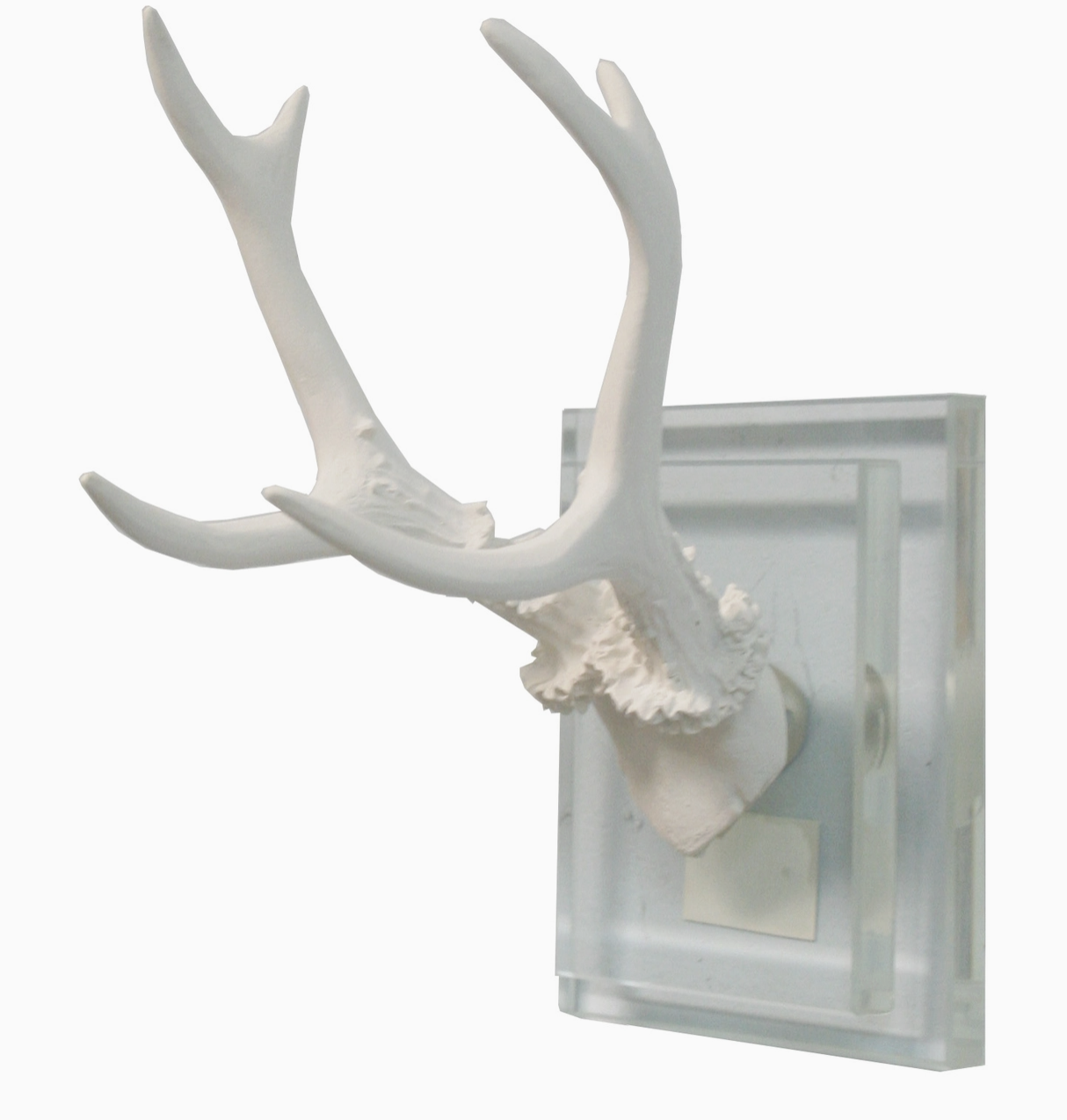 White Antler Double Glass Wall Mount - 7"H Size $42.99 Excl. tax In stock Add to cartLogin for wishlistDescriptionHand painted cast resin white antler on a double glass wall mount. 5.3 x 3.5 x 7 in