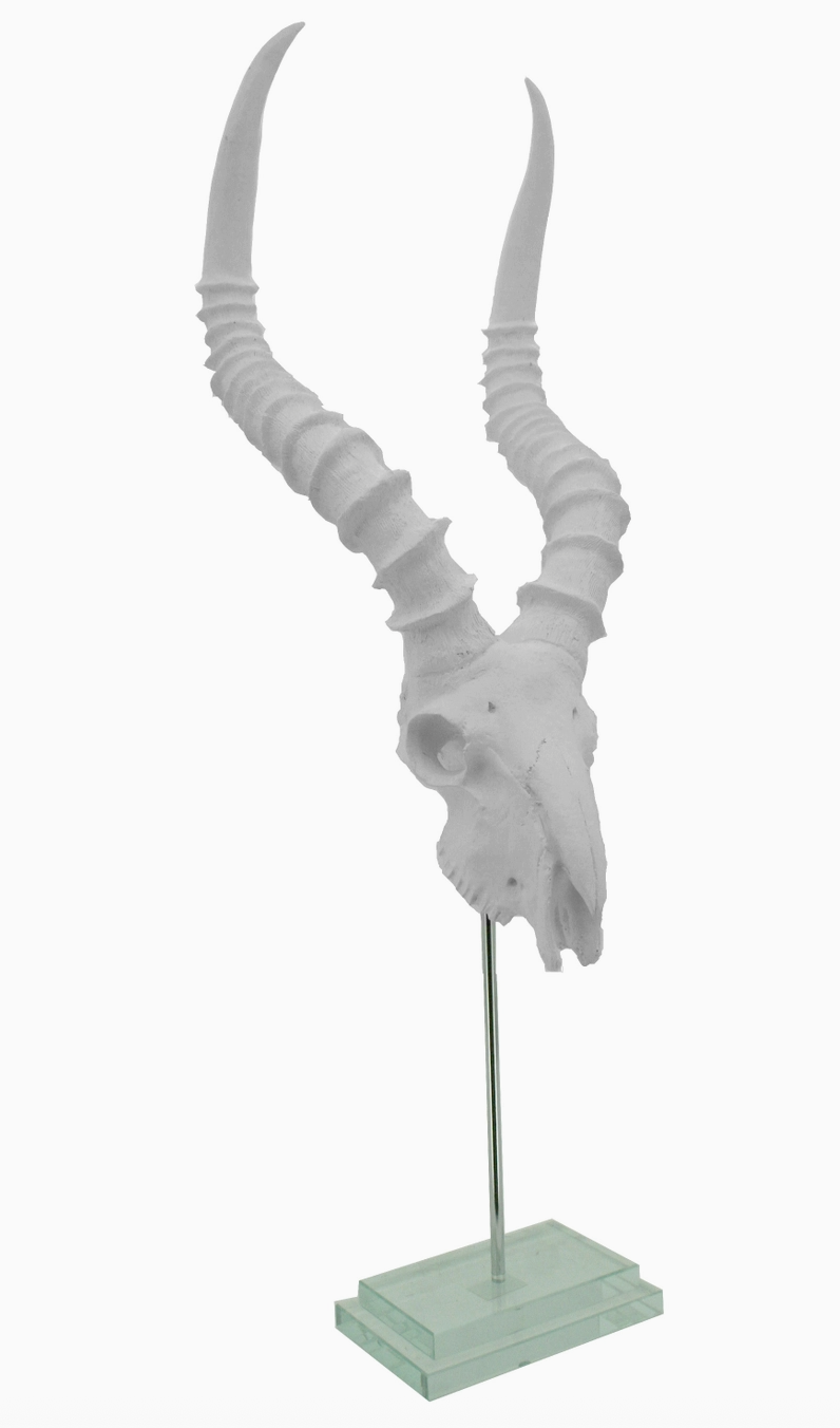 White Kudu Skull Double Step Glass Base $135.75 Excl. tax In stock Add to cartLogin for wishlistDescriptionHand painted cast resin white kudu skull on a glass double step base. 9 x 8 x 28 in
